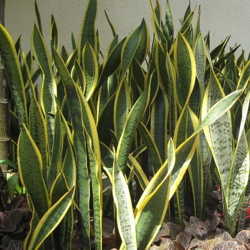 Also known as Mother-in-law’s tongue. A tough, hardy succulent originating from Africa with upright, fleshy, lance-shaped foliage. Leaves are green with horizontal bands of grey-green and the variegated form also has creamy yellow margins. Keep watered during warmer months but avoid getting water into the rosettes.