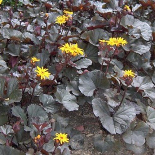 Has large glossy, burgundy-green foliage that make it a “must have” for modern gardens and looks great in a decorative container. Produces large golden yellow daisy-like flowers in summer that stand above the leaves. Keep moist during warmer months and cut back during summer to encourage fresh new growth in spring. Prefers partial shade and grows to about 90cm x 100cm.