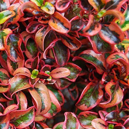 A showy shrub whose foliage consists of rich dark orange, green and red during the summer, then becoming redder as winter approaches. Easy to grow in full sun or partial shade. Will need some protection from heavy frosts. Suitable for growing in coastal locations. Evergreen.