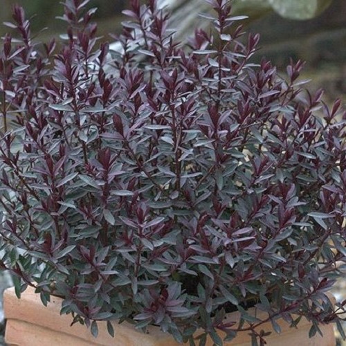A stunning evergreen shrub with glossy, dark burgundy foliage producing a smattering of pale pink flowers during Summer and into Autumn. Best grown in full sun to help maintain colour and requires free-draining soils, tolerates dry periods. Give a light trim after flowering has finished.