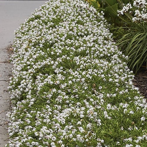 A hardy, compact, evergreen shrub that has a mass of white flowers during summer. Native that prefers full sun and free-draining, average type soils. Trim after flowering has finished.