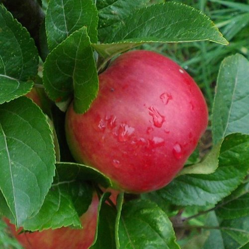 Old European variety known to have high levels of benefical goodies. Medium sized apple with bright red skin over green base with sweet, crisp, firm, good eating flesh. Early season and disease resistant. Produces good, heavy crops when pollinated by other varieties of apple such as Gala, Peasgood Nonsuch, Golden Delicious, Granny Smith, Hetlina, Bramley’s, Royal Gala, Kidd’s Orange Red, Monty’s Surprise and Winter Banana.