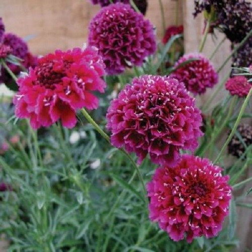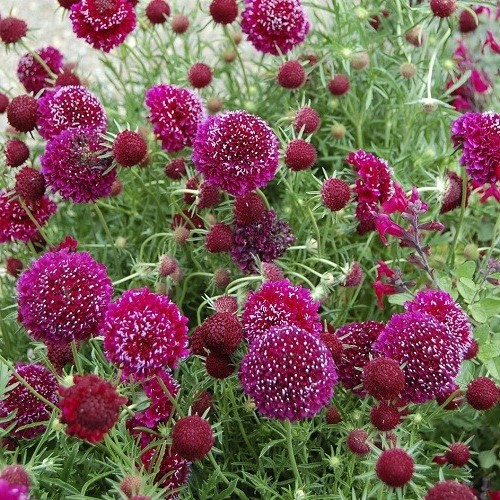 A perennial with stunning deep magenta, pincushion-like flowers speckled with white throughout Summer. They are easy to grow, low maintenace having sturdy, upright flower stems. Removing dead flowers will encourage a prolonged flowering season. May be grown in full sun or partial shade where soils are moist, fertile and free-draining.