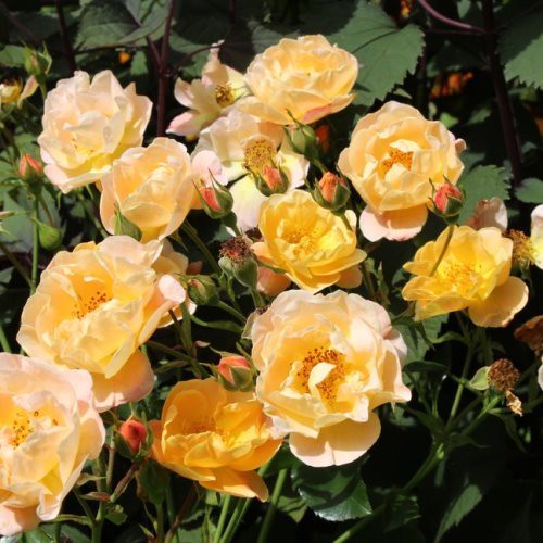 Masses of orange-yellow blooms, flushed with shades of pink and peach and has a light, sweet fragrance. Bushes are low growing, compact with glossy, dark green foliage that is resistant to black spot and mildew. Grows to about 90 cm high and 90cm wide. Full sun or semi-shaded/filtered light.