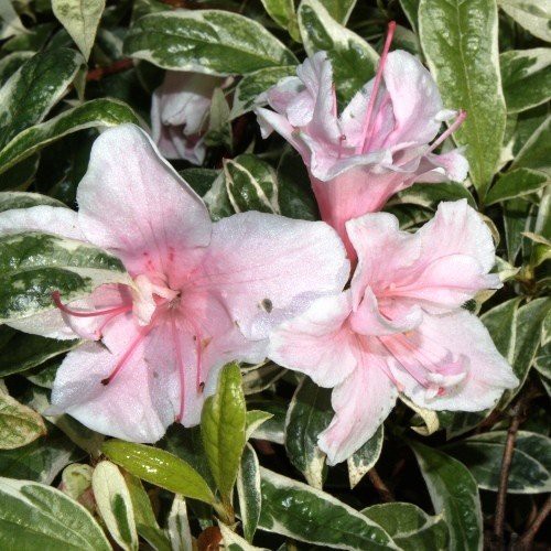 Soft pink, semi-double flowers and variegated foliage. Evergreen. 60cm.