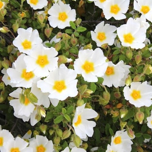 A spreading, low-growing, evergreen shrub with small, crinkled grey-green foliage and felted underside. In Spring to mid-Summer, white, crepe-like flowers are on display. Grows best in full sun where soils are free-draining. Tolerates frost, periods of drought, open, exposed sites and is perfect for growing in coastal locations. May be used as a ground cover.