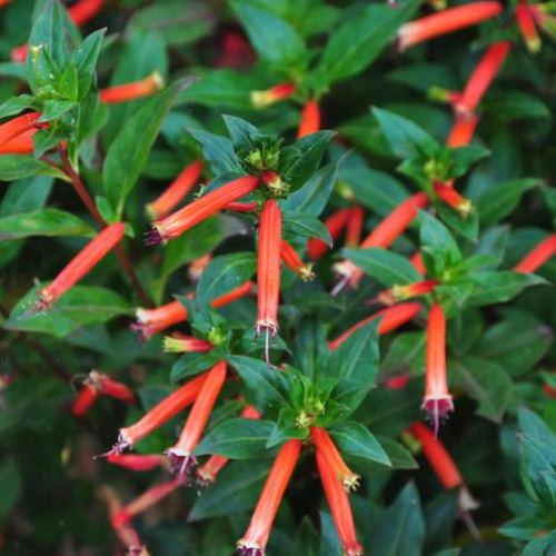 Also known as Cigar Plant and Firecracker Plant. A spreading evergreen sub-shrub with lance-shaped leaves and tubular scarlet flowers, black at the tips and edged white. Produces flowers in spring and through summer. Suitable for mixed borders, rockeries and look great when grown in containers. Plant in full sun or partial shade where soil is fertile, moist but free-draining. Trim after flowering to maintain a tidy shape.