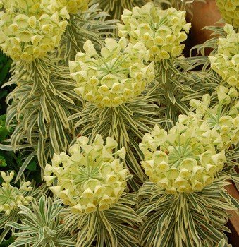 This colourful selection has greyish evergreen leaves strongly edged with creamy white, forming an upright, bushy mound. Conical flower heads appear in spring, made up of creamy bracts with a green eye.