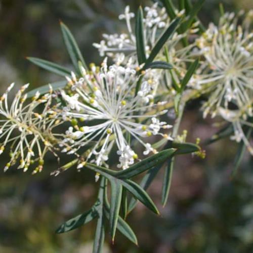 Grevillea glabrata is a spring-flowering, hardy, evergreen shrub. It often has a rather weeping growth habit and grows to around 3m tall and somewhat wider. The widely spaced white flowers make the heads very distinctive. May be planted in semi-shade but does prefer full sun in most types of soil that are free-draining.