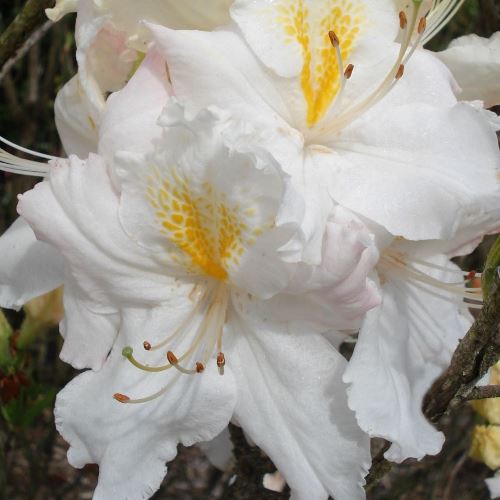 Has large, pure white flowers with a prominent yellow throat that appear throughout spring to very early summer. May be grown in full sun or semi-shade but requires soils to be moist, free-draining, slightly acidic and containing plenty of organic material. A hardy, deciduous shrub that grows to between 1.4m and 1.6m in height.