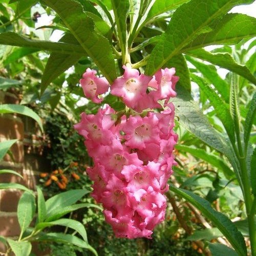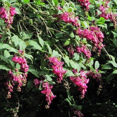 A semi-evergreen shrub that produces pendulous racemes of large, pink flowers with white throats from early Summer. Prefers a sunny, sheltered position where soils are moist, rich in humus and free-draining.