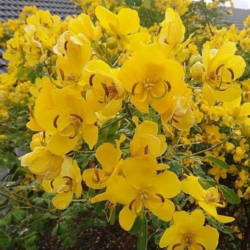 An evergreen shrub that forms a rounded bush and produces a mass of bright yellow, Buttercup-like flowers from Autumn and through Winter. Best grown in a sunny position where soils are reasonably fertile and free-draining. Suitable for growing in coastal locations. Responds well to being lightly trimmed as that will help to encourage new growth.