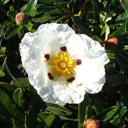 A compact, evergreen shrub with a spreading growth habit. Produces white flowers with a dark, crimson spot at the base of each petal. Blooms begin to emerge in late spring and through into summer. Plant in full sun where soils are free-draining. Frost hardy, tolerates periods of drought, open, exposed sites as is ideal for growing in coastal locations. may be trimmed after flowering as finished to help maintain shape.