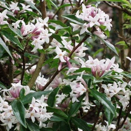 An evergreen which has only recently become available in New Zealand. Grows quickly to form an upright bush. Has white flower that are tinged with pink, fragrant and begin to appear in winter through into spring. May be grown in either full sun or partial shade where soils are fertile, moist but free-draining. Hardy.