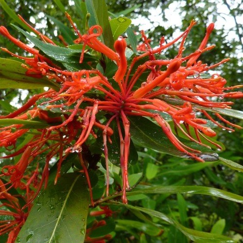 Better known as the Chilean Fire Bush or Chilean Fire Tree. They are an upright, evergreen shrub or small tree with leathery, lance-shaped leaves and clusters of narrowly, tubular scarlet flowers in late spring and early summer. Cold hardy but does prefer a warm, sheltered position with average type soils that are free-draining but should not be allowed to get dry especially during the summer months. May be grown in either full sun or semi-shade and grows to about 4.5m x 2.5m.