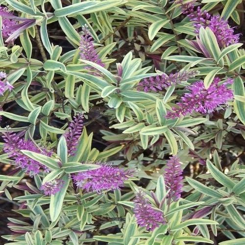 Has cream and green variegated foliage and light purple-blue flowers during Summer and Autumn. A hardy, native, evergreen shrub grown in either full sun or partial shade and suitable for growing in coastal locations.