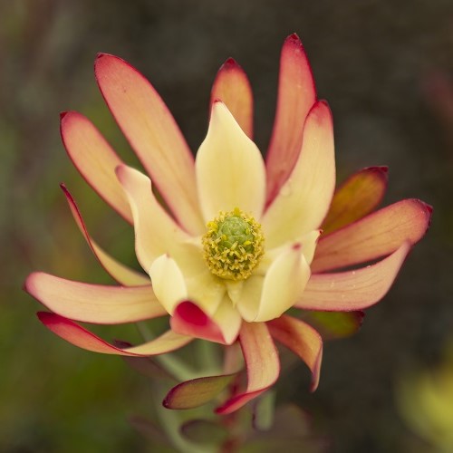 An attractive, evergreen shrub with blue-greeb foliage and producing creamy white flower bracts in Spring that gradually become pink as they age. Requires full sun in soils that are free-draining. Hardy and tolerates periods of drought and may be grown in coastal locations and in suitably sized containers. Trim back after flowering has finished to help maintain shape and to encourage new growth.
