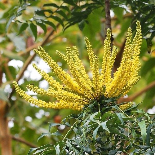 A hardy, evergreen shrub with thick stems and leathery, dark green, pinnate foliage and bearing erect spikes of lightly scented, bright yellow flowers  during Autumn and into Winter. Best grown in partial to full shade where soils are fertile, rich in humus, suitably moist but free-draining. Shelter from cold, drying winds.