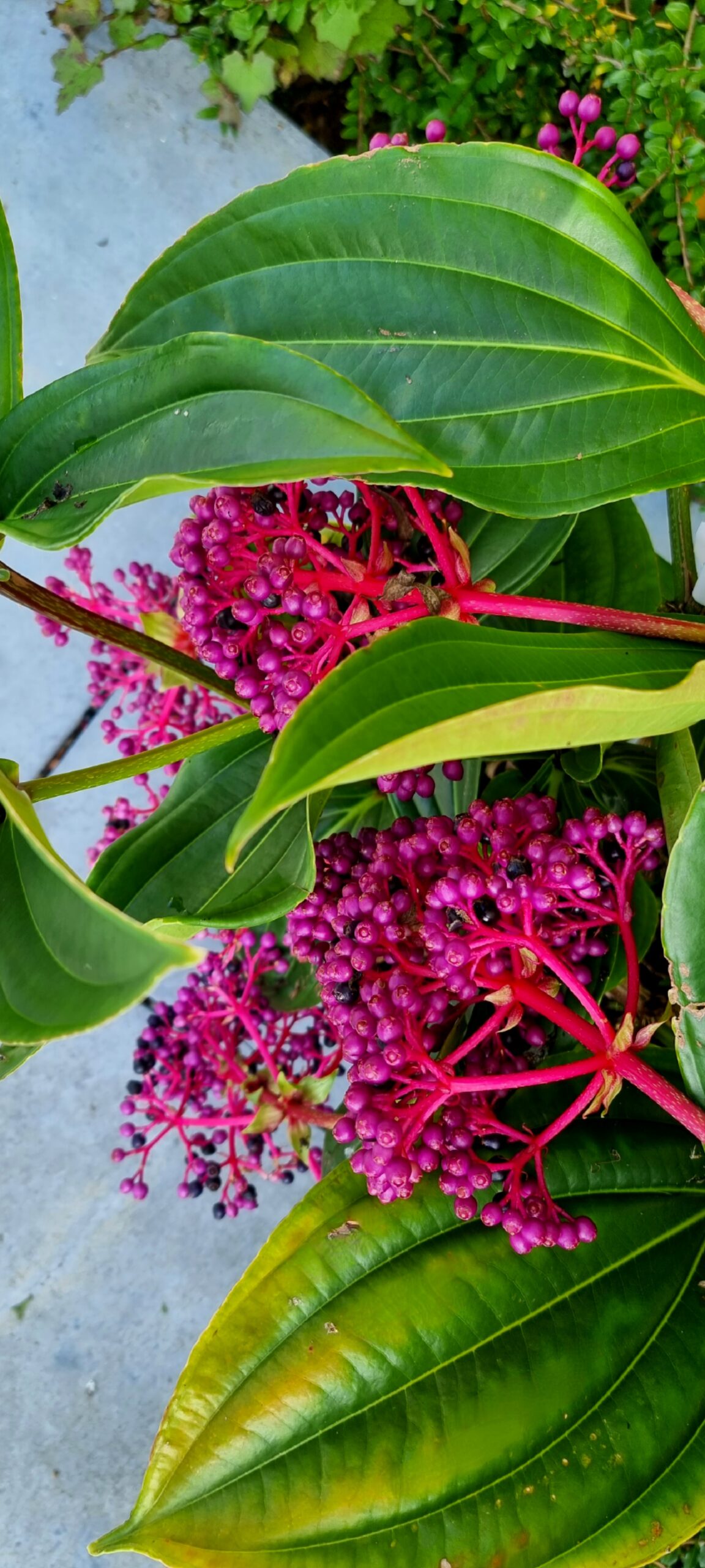Also known as Malaysian Grapes. Has large, leathery, glossy green foliage with large, cascading racemes of pink flowers that gradually become a magenta colour before turning deep purple as they mature. An evergreen shrub that prefers a situation with dappled light and free from frosts. Rare and unusual.