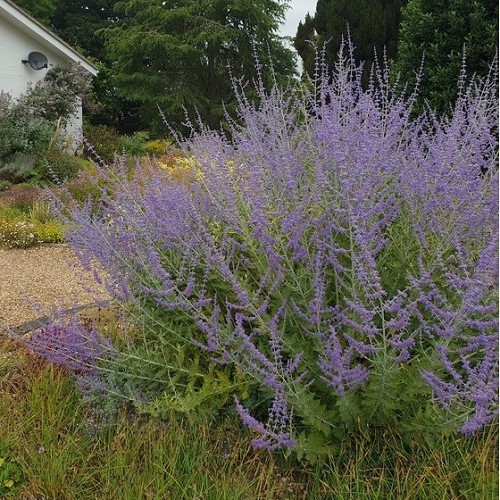 An award winning sub-shrub or deciduous perennial that is multi-stemmed with grey-green foliage. Has clusters of small, violet-blue flowers during Summer and through to Autumn. Plants are hardy and resist drought, heat and poor soils. Best grown in full sun where soils are free-draining. Suitable for growing in coastal locations.