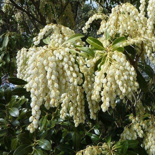 Also known as Lily-of-the-valley shrub. Produces long panicles of snow white flowers that start to appear in spring. A hardy, evergreen shrub that grows well in either full sun or partial shade where soils are slightly acidic, contain organic material, are moist and free-draining. Grows to about 2m x 1.5m.