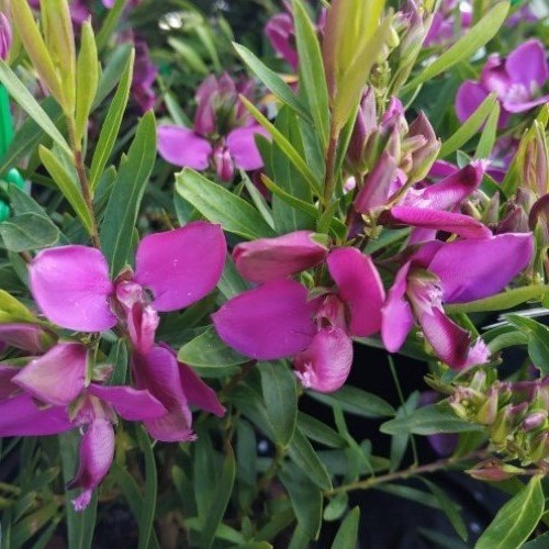 A hardy, evergreen shrub with a compact growth habit producing clusters of rich, purple sweet pea-like flowers from mid-Spring and through to Autumn. Thrives in either full sun or partial shade where soils are average to fertile and free-draining. Suitable for growing in coastal locations. May be given a light trim after flowering has finished.