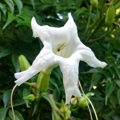 Also known as Canton Lace. Has a bushy growth habit with dark, glossy foliage and once established, they produce long, trumpet-shaped flowers. Requires free-draining soil that needs to be kept moist but not over-watered. Avoid drafts.