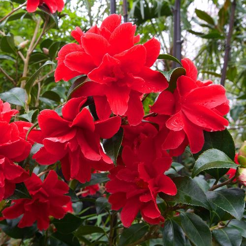 A vigorous, upright, evergreen shrub, valued for its luxuriant rich green foliage and bright red, semi-double flowers. Very free flowering with flowers all along the stems. Prefers sheltered site in either full sun or partial shade where soils are well-drained. Suitable as a specimen shrub and can be given a light trim after flowering has finished.
