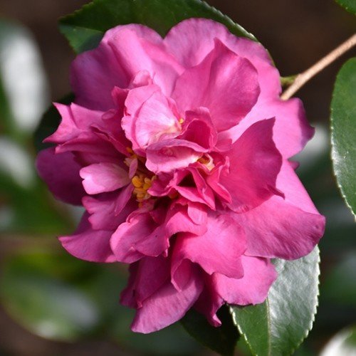 An early winter flowering camellia with double, ruby-pink flowers. Grows well in full sun or part shade. Can be used to form hedges, screens and is a stunning specimen shrub. May also be trimmed to create standards. Hardy, evergreen and tolerates dry conditions.