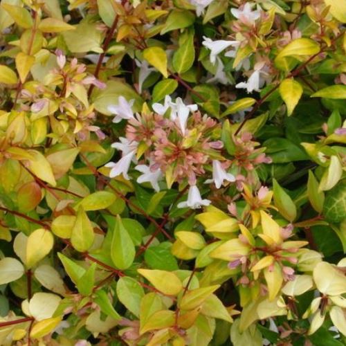 This variety of Abelia is an evergreen/ semi-evergreen shrub with eye-catching golden-yellow variegation on the young foliage. The golden leaf colour is most vivid when this Abelia is planted in a warm, sunny position and the older leaves turn dark green. Clusters of white flowers appear in mid to late spring and through summer. Prefers a semi-shaded position in average, free-draining soils, frost hardy and can tolerate coastal sites.