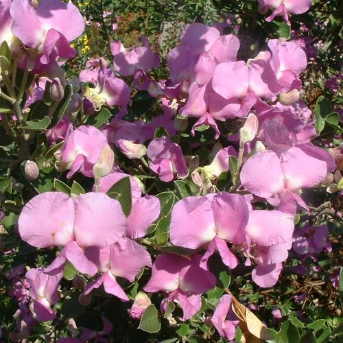 Also known as Water Blossom Pea or Sweet Pea Bush. This shrub has grey-green leaves and grows to a sturdy height of 2-3m and up to about 2m in width. Early growth can be cut back to create a rounded shrub or the plant can be trained into the shape of a small tree, very well suited to a small garden. In spring, highly fragrant, pink, pea-like flowers begin to appear. Best grown in a sheltered position that offers full sun or partial shade where soils are light and free-draining. Evergreen.