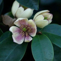 A very attractive shrub with glossy green foliage and flowers that are larger than figo Port Wine. Highly scented, cream white in colour with burgundy edges to the petals that start to emerge in late Spring, early Summer. Plant individually as a feature or a background plant, as a specimen or may be used to form hedges and screens. Likes full sun to part shade, rich organic soil that is moist but free-draining. Responds well to being trimmed once flowering has finished.