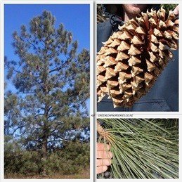 Big Cone Pine. Huge pine cones on an upright bushy tree. Tolerates heat, wind,frost and drought. 10m.
