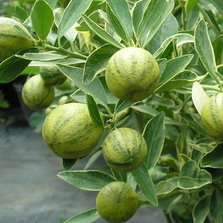A very ornate citrus with variegated, evergreen foliage and striped fruit. Has sweet, fragrant, white flowers with the fruit being juicy and thin skinned. Plant in a sunny position with fertile, moist but free-draining soil. May also be grown in containers. Protect from frost.