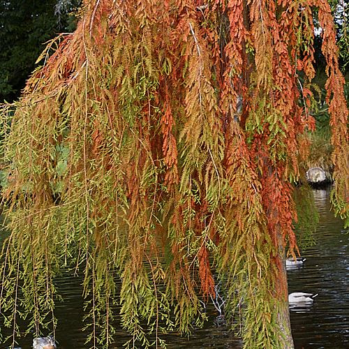Lovely small weeping tree for damp areas. Cascading soft lime green foliage. Orange/brown in autumn. 5m.