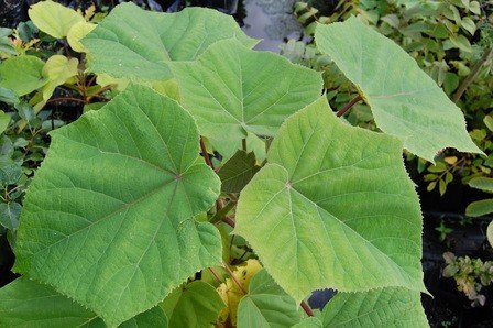 Magnificent tree flowering at a young age. Flower are heliotrope,fragrant and speckled purple in the throat – trumpet shaped. Huge leaves. 8m.