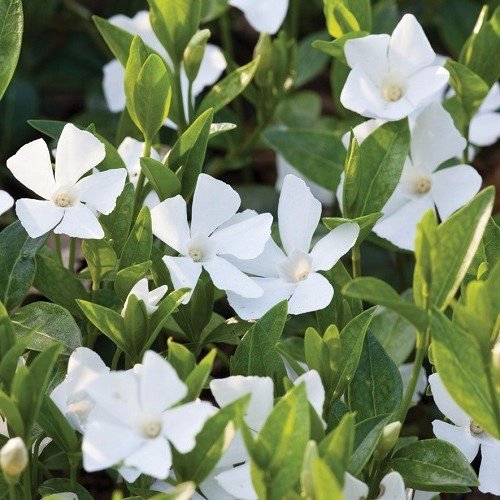 A prostrate, trailing, evergreen perennial that is ideal for underplanting or as a ground cover. Has dark, glossy foliage and single, pure white flowers in spring and throughout summer. Very hardy, vigorous and suitable for growing in full sun or in shade.