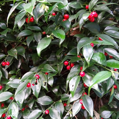 Also known as Chinese Box and Winter Box. A hardy, evergreen shrub producing small, fragrant cream-white flowers during Winter then followed by rich red berries. Grows best in moist, fertile, free-draining soil in part to full shade, tolerates periods of dry conditions. May be grown to create low-growing hedges.
